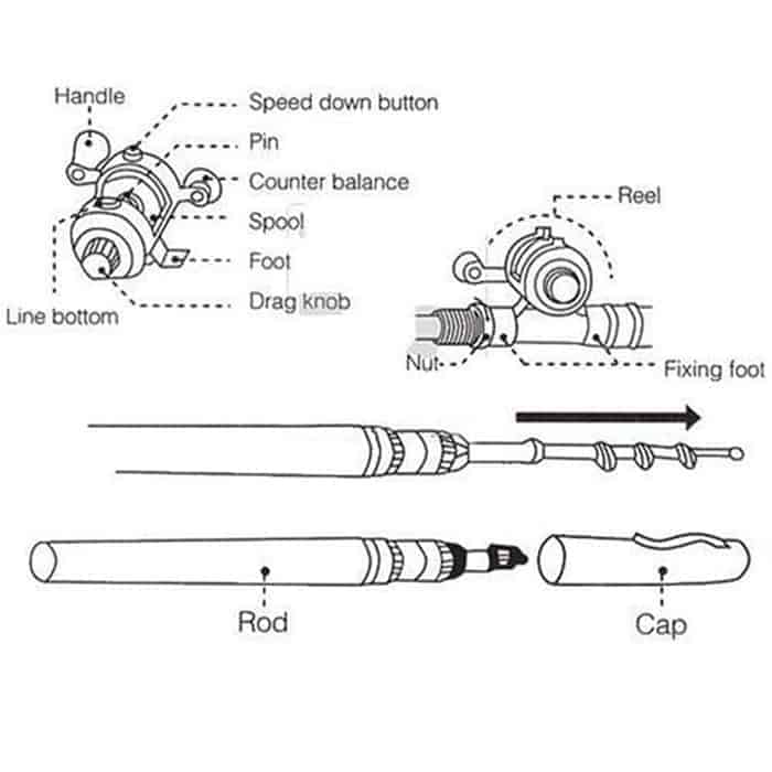 Rybářská souprava se skládá z teleskopické udice, která se dá sklopit pro snadný transport, navijáku a ochranného pouzdra. Kapesní velikost umožňuje uživateli vychutnat si rybolov na každém kroku, bez nošení těžkého rybářského náčiní.