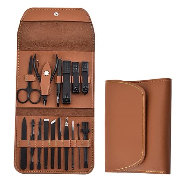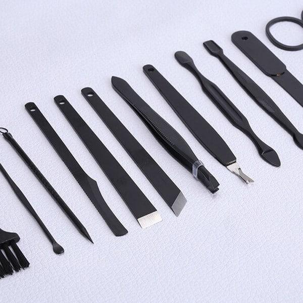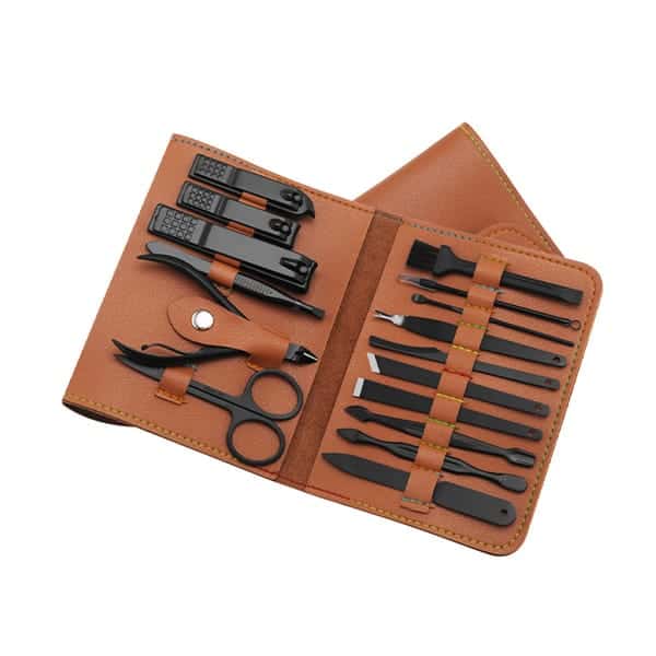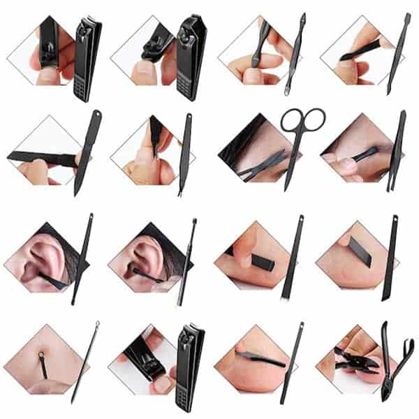 - Pomůcky Pro Manikúru: 2x kleštičky na nehty: na stříhání nehtů, 1 x pilník na nehty: hladké a zaoblené nehty, 1x vidlička na odumřelou kůži: ostříhejte nehty, puchýře, odumřelou kůži atd., 2x objstranná pomůcka na čištění nehtů: odstaňování nečistot za nehty, zatlačování nehtové kůžičky a odstraňování starého laku na nehty, 1x kartáček na čištění pomůcek