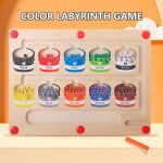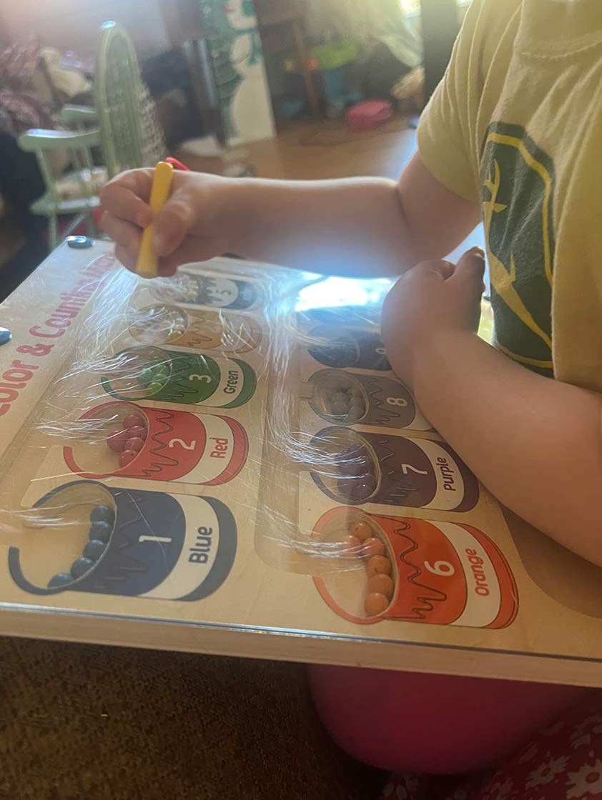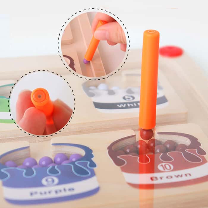 Tato didaktická hračka má hůlku, kterou dítě třídí barevné magnetické kuličky do správných políček!